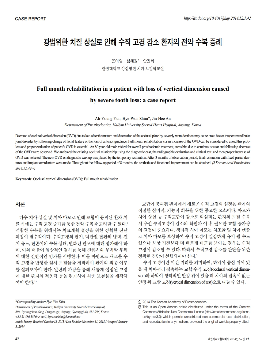 치아 마모와 상실로 인해 감소된 수직고경을 정확히 진단하고 이를 증가시켜 전악수복을 시행함으로써 기능적·심미적 회복을 달성한 증례 보고